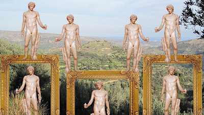 Σε πολλές συνθέσεις για την αρχαία Πραισό χρησιμοποιώ αγάλματα και αγαλματίδια, θέλοντας να δείξω το πέτρωμα του χρόνου σαν να είναι οι φιγούρες πια απόμακρες και πετρωμένες. Στις πιό πολλές αναπαραστάσεις οι πρωταγωνιστές δείχνουν να ποζάρουν στον φακό σαν τις παλιές φωτογραφίες όταν όλη η οικογένεια στηνόταν απέναντι από αυτόν που την απεικόνιζε.