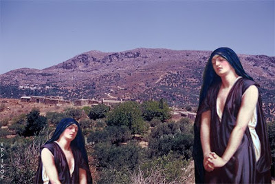 In many of my compositions for ancient Praisos I use statues and figurines, wanting to show the petrifaction of time as if the figures are isolated and petrified. In most representations the actors seem to pose like in the old photos facing the camera.